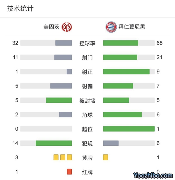 第44分钟,拜仁扩大比分!舒波莫廷接长传球背身秒传萨内单刀机会推射破门,拜仁客场3-0美因茨。