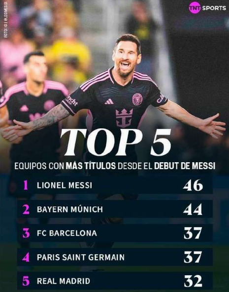 JRS直播网讯 据TNT统计,自梅西2004年首秀以来,他的冠军数比任何俱乐部都多。