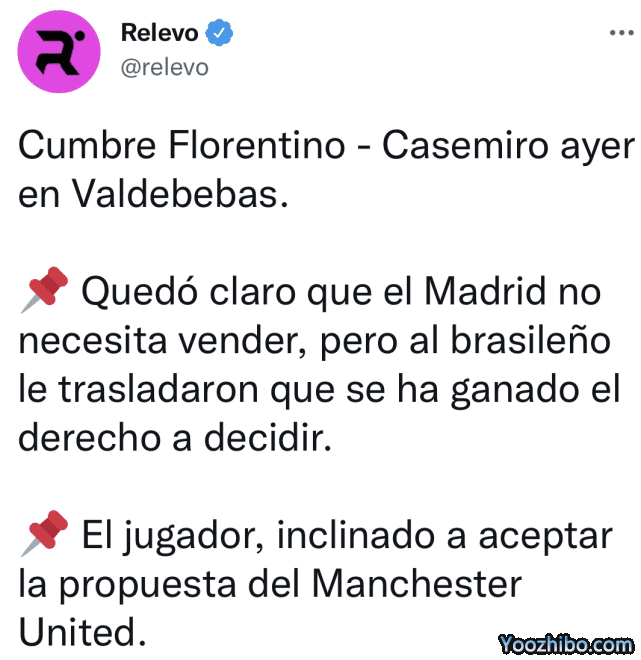 西媒透露,弗洛伦蒂诺昨天与卡塞米罗进行了一次会面,双方在皇马的巴尔德贝巴斯基地进行了对话,弗洛伦蒂诺告知卡塞米罗,皇马今夏虽然没有出售核心球员的需求,但是30岁卡塞米罗有权利决定自己的未来。